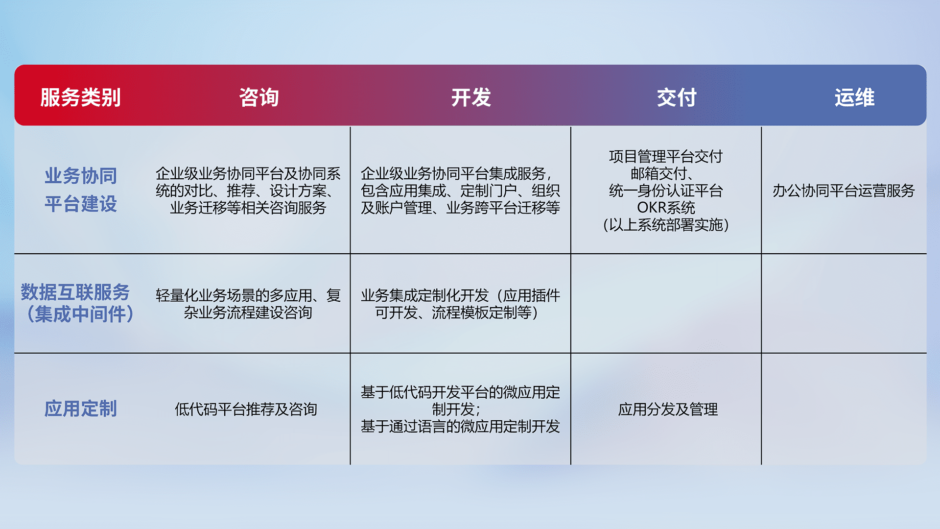 针对钉钉、、、、企微、、IDaas等平台级产品提供产品的规划、、方案、、交付、、、、定制化开发等服务,,实现如统一协同办公、、智能客户服务、、混合会议管理、、智能数据查询、、等业务场景,,,,实现数字化转型。。。