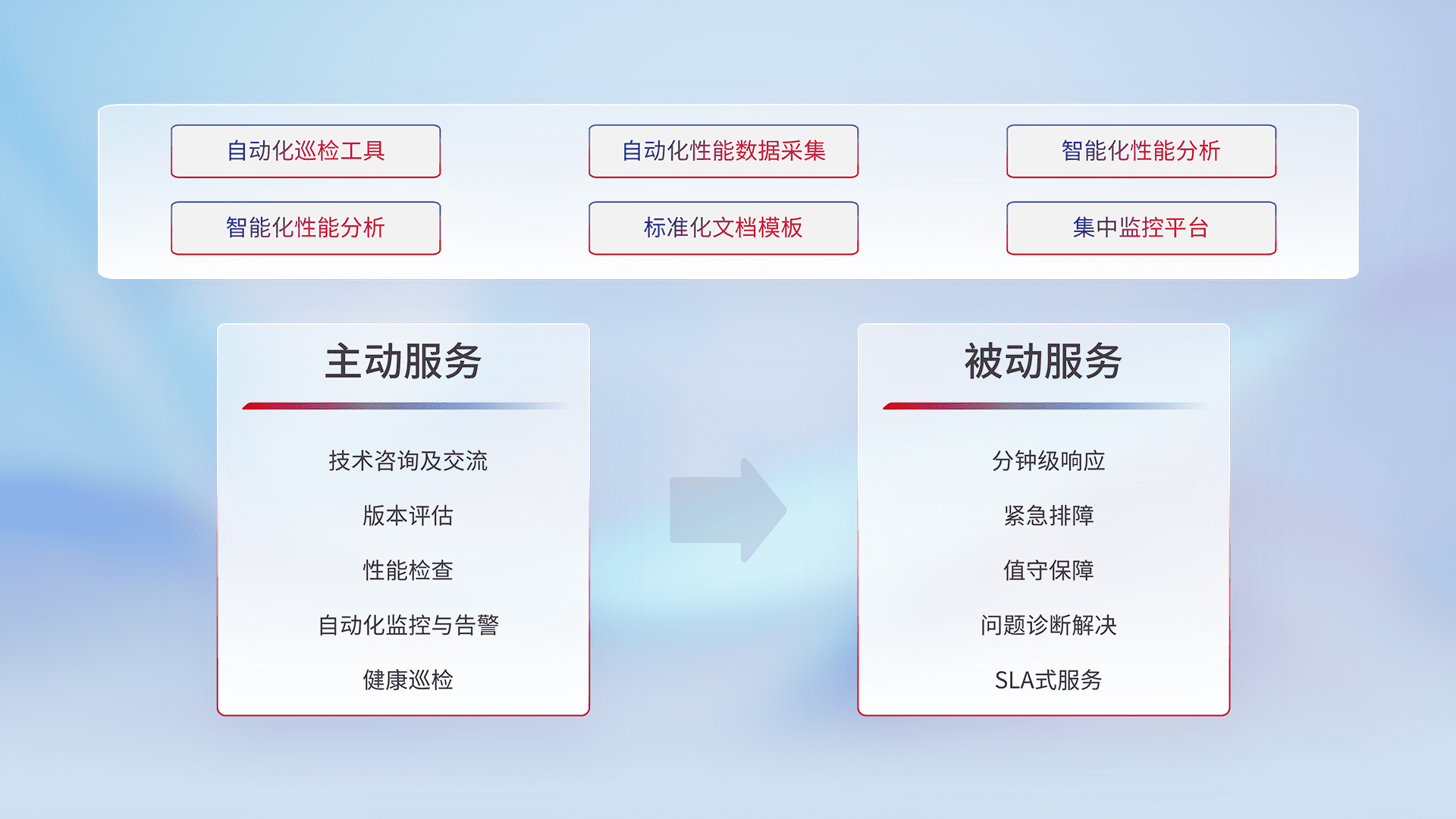 智能化工具和标准化文档,,保障服务质量,,,,提供主动服务(包含技术咨询、、、、版本评估、、、性能检查、、自动化监控与告警、、健康巡检)和被动服务包含(分钟级响应、、紧急排障、、、值守保障、、、、问题诊断解决、、、、SLA服务)。。